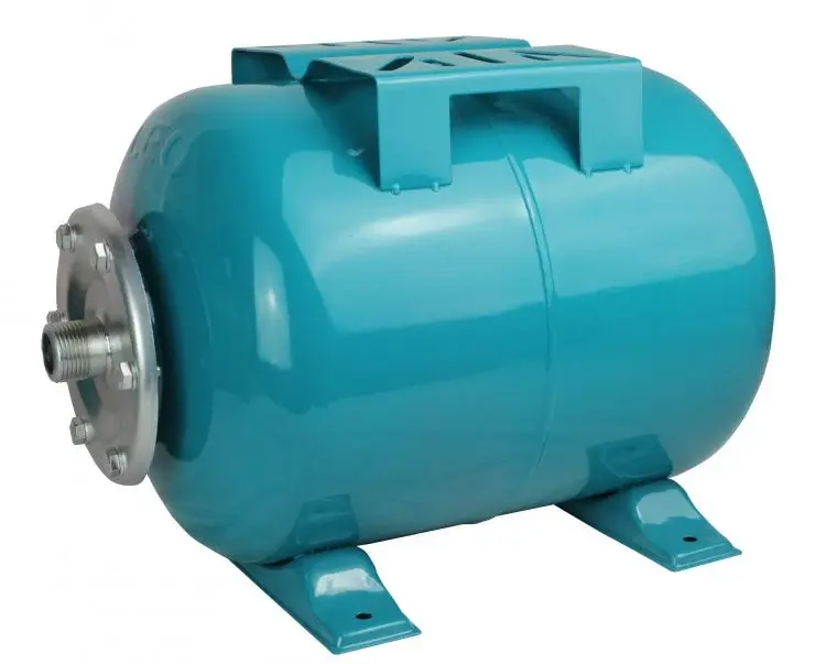 Мембранный напорный бак бывает горизонтального и вертикального исполнения, емкостью от 2 литров и более. Горизонтальные гидроаккумуляторы имеют площадку для крепления насосов
