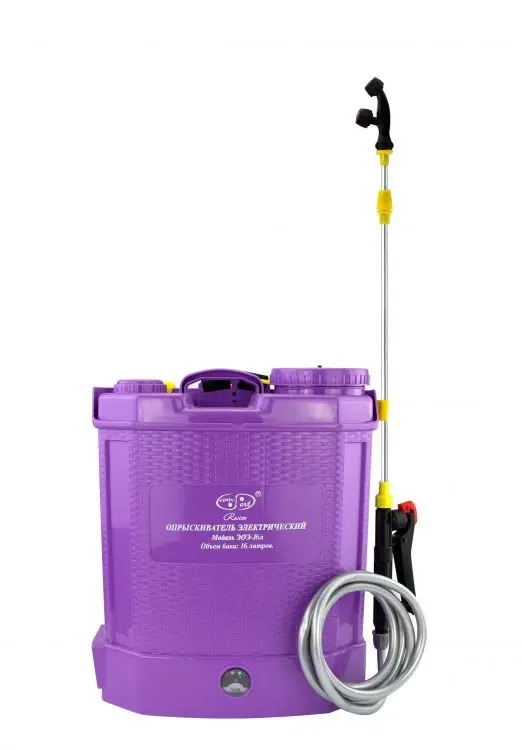 Аккумуляторный электрический опрыскиватель Умница ЭОЭ-16 предназначен для химической защиты растений от вредителей и болезней, борьбы с сорной растительностью, распыления воды, удобрений, гербицидов, пестицидов, противоэпидемической обработки скота и т.д. Также они могут использоваться для дезинфекции, дезинсекции, мытья окон, стен, машин. Электрический опрыскиватель сконструирован и изготовлен с использованием современных технологий, в 8 раз эффективней механических опрыскивателей, существенно экономит Ваше время и силы! Комплектация Опрыскиватель в сборе - 1 шт. Бак электрического опрыскивателя в сборе - 1 шт. Телескопическая удочка из нержавеющей стали - 1 шт. Ремни для переноски (упряжь) - 1 комплект Зарядное устройство (сетевой адаптер 220В, 50 Гц) - 1 шт. Комплект распыляющих насадок - 1 комплект Ремонтный комплект электрического насоса - 1 шт. Фильтр заливной горловины - 1 шт. Съёмный фильтр внутри бака (предустановлен) - 1 шт. Гарантийный талон - 1 шт. Руководство по эксплуатации - 1 шт. Фирменная упаковка.