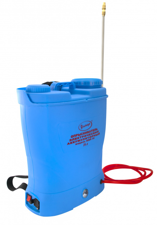 Электрический аккумуляторный опрыскиватель "Умница" ОЭЛ-16 предназначен для химической защиты растений от вредителей и болезней, борьбы с сорной растительностью, распыления воды, удобрений, гербицидов, пестицидов, противоэпидемической обработки скота и т.д.