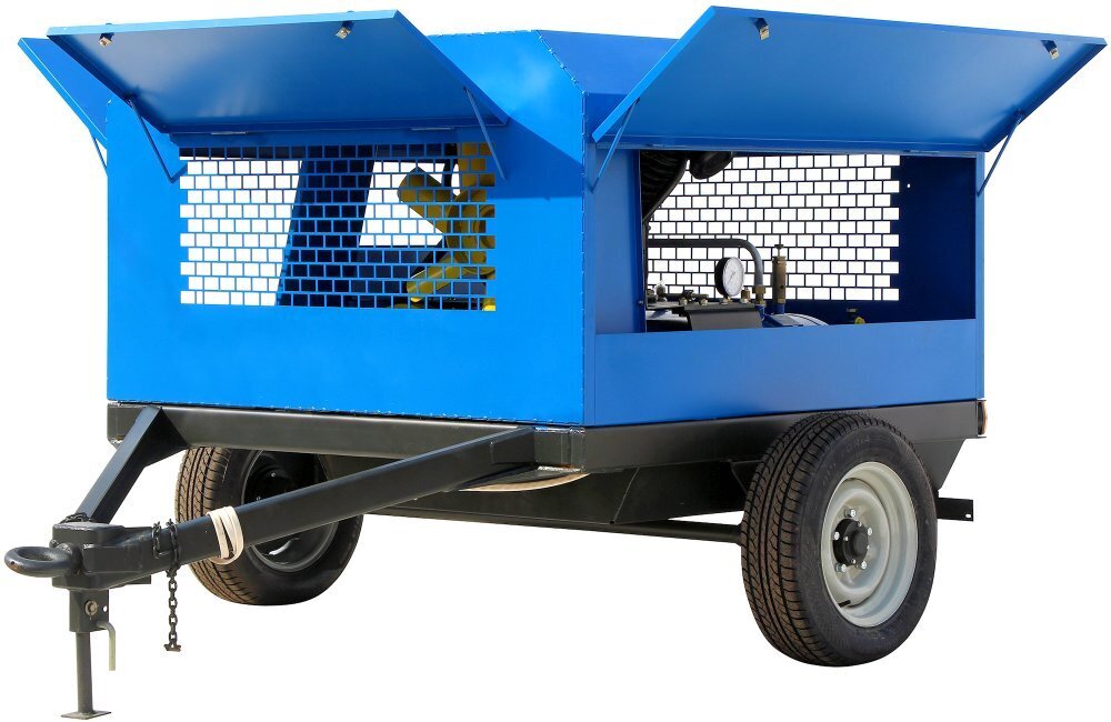 В нижней части рамы закреплены два горизонтально расположенных ресивера суммарным объемом 2 х 150 л. Температура воздуха на всасывании от +5 до +45 °С. Размеры 315 х 215 х 175 см, масса 980 кг.