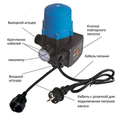 Данное устройство предназначено для автоматизации и оптимизации работы насоса, а также защиты насоса от повреждений, вызванных работой без воды. Оно автоматически запускают и останавливают насос при наличии необходимого давления в системе и автоматически отключают питание насоса при появлении сбоев в подаче воды или работе насоса.