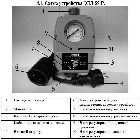 Данное устройство предназначено для автоматизации и оптимизации работы насосов и насосных станций. Оно автоматически включают насос при снижении давления в системе водоснабжения (при открытии крана, начале работы системы полива и т.д.) и выключает при прекращении водопотребления (при закрытии крана, окончании работы системы полива и т.д.). Кроме этого данное устройство предназначено для защиты насоса от повреждений, вызванных работой без воды (защита от сухого хода), а также автоматически отключает питание насоса при появлении сбоев в подаче воды или работе насоса. Модель ЭДД-59-Р оснащена встроенным манометром, который обеспечивает визуальный контроль давления в системе водоснабжения. Модель ЭДД-59-Р укомплектована проводом длиной 1,3 м со штепселем европейского типа и проводом длиной 40 см с розеткой для подключения насоса. Данное устройство предназначено для перекачивания чистой воды, не содержащей твердых частиц. При наличии в воде нерастворимых примесей, на входном трубопроводе необходимо установить фильтр (не входит в комплект поставки).